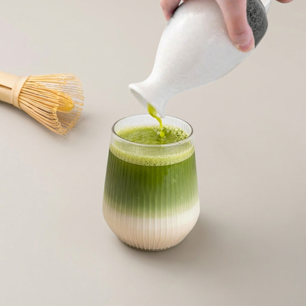 Le matcha ne s'infuse pas, il se fouette. Contrairement au thé en feuilles, vous consommez ici la poudre entière, ce qui explique sa richesse nutritionnelle exceptionnelle. Utilisez un fouet en bambou (chasen) ou, à défaut, un petit fouet électrique pour créer cette texture mousseuse caractéristique.